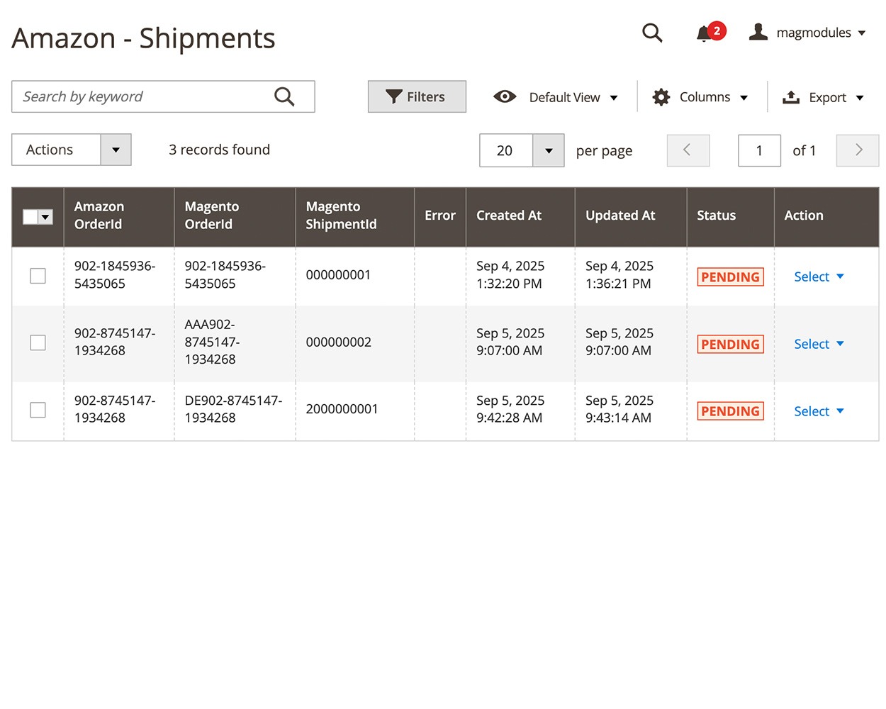 Met het vertrouwde rastergebaseerde interface van Magento kunt u alle Amazon-activiteiten nauwkeurig volgen en beheren. Elke Amazon-order bevat een speciaal tabblad met alle marketplace-details, en u kunt direct acties ondernemen zoals importeren, annuleren of verwijderen vanuit het Magento-dashboard. Synchronisatiefouten of importproblemen worden automatisch gelogd en gemarkeerd voor snelle oplossingen.