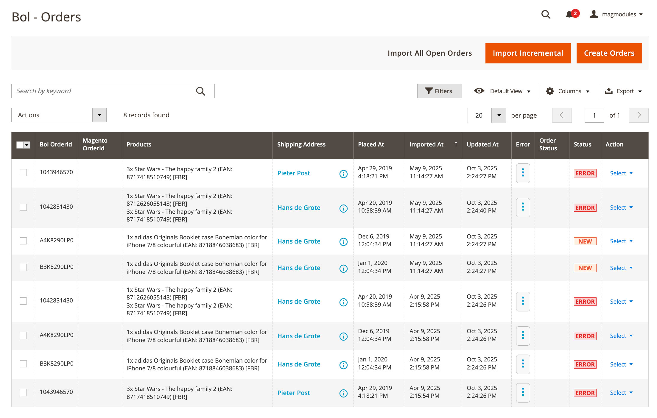 - Geïmporteerd Op: Wanneer de order in Magento is binnengehaald.
