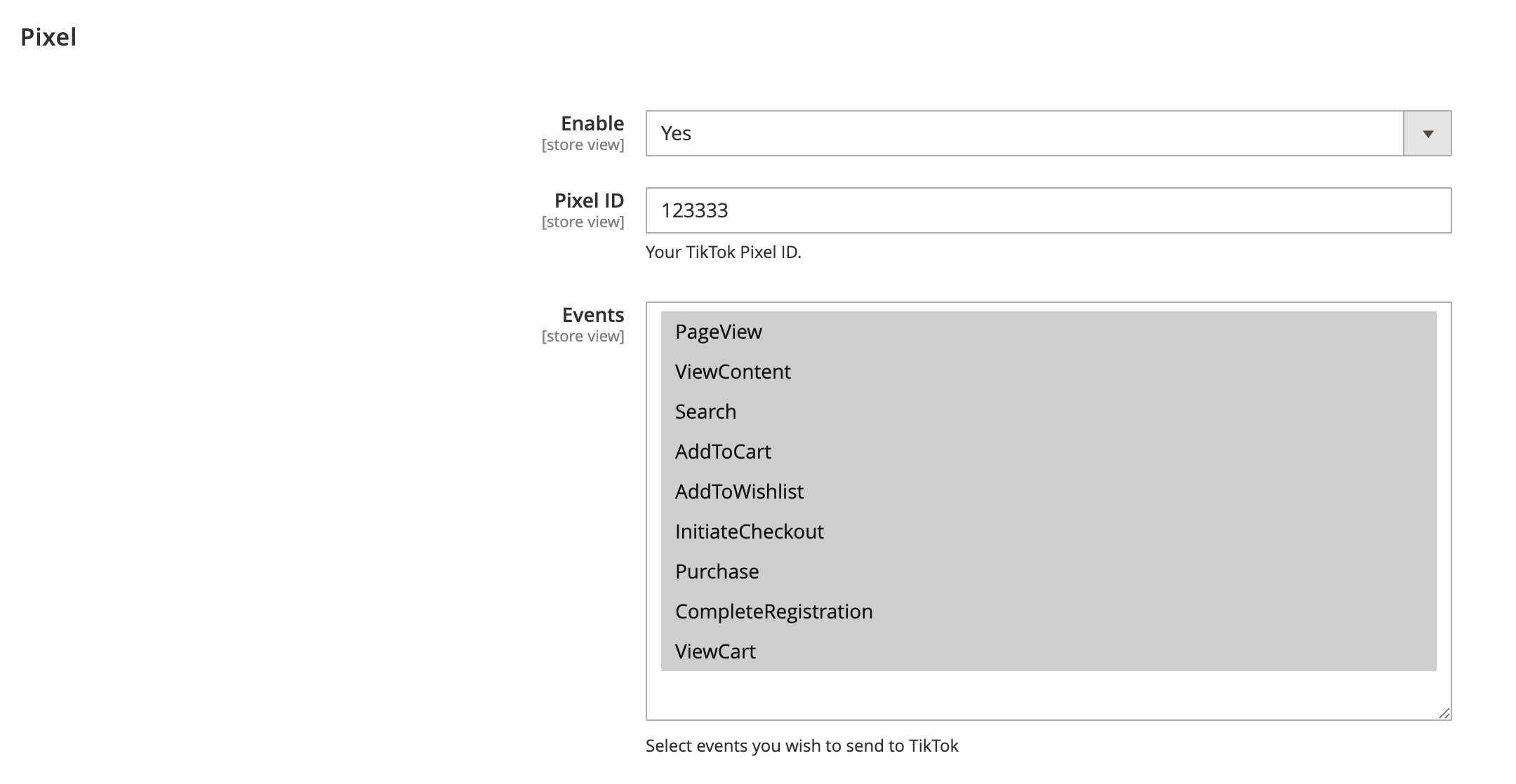 - Ga naar Stores > Configuration > Magmodules > TikTok > Pixel.