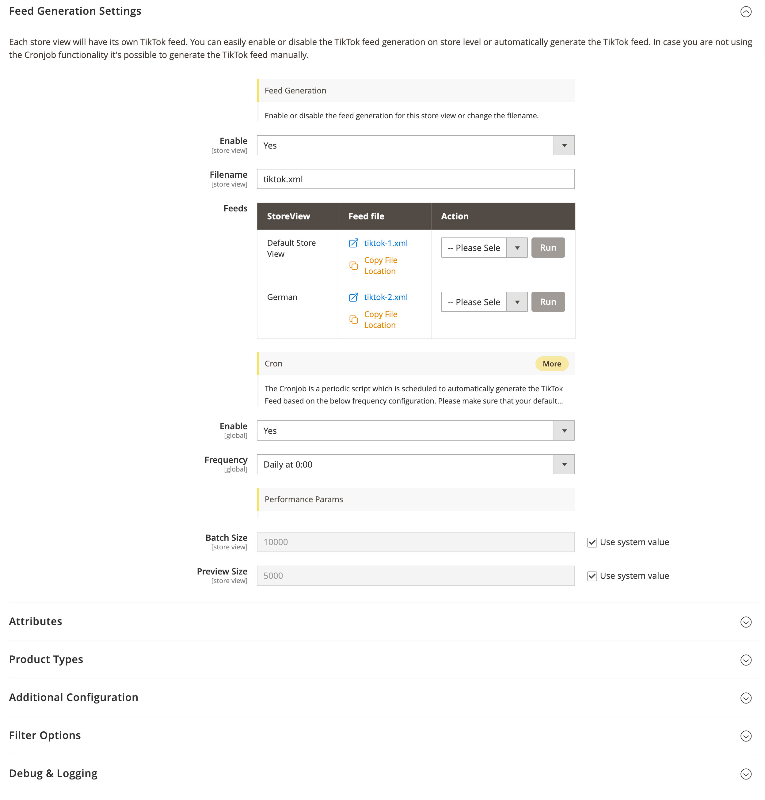 In de TikTok Feed configuratie van de Magmodules TikTok extensie stel je in hoe productfeeds per store view worden aangemaakt. Deze feeds worden gebruikt om je Magento catalogus te koppelen aan TikTok voor catalogus advertenties, dynamische remarketing en producttagging.