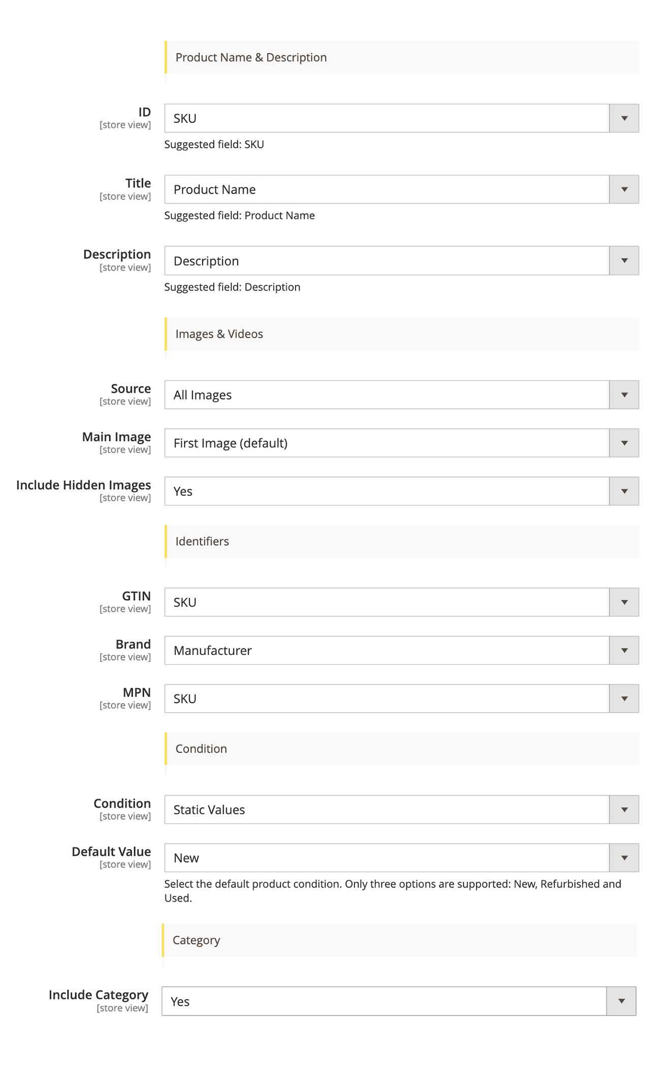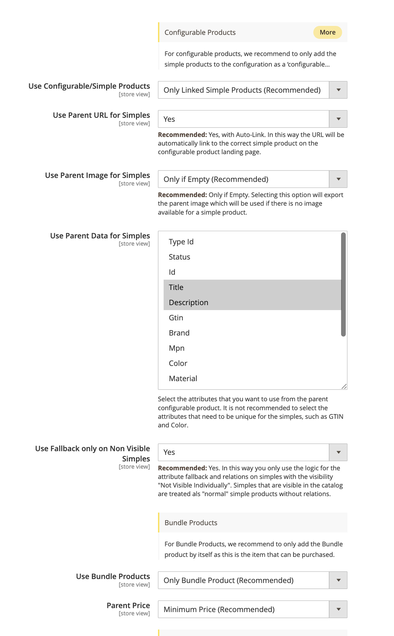. Dit zorgt ervoor dat elk product uniek en traceerbaar is. - Titel: Selecteer het Magento-attribuut dat wordt gebruikt als producttitel (standaard: