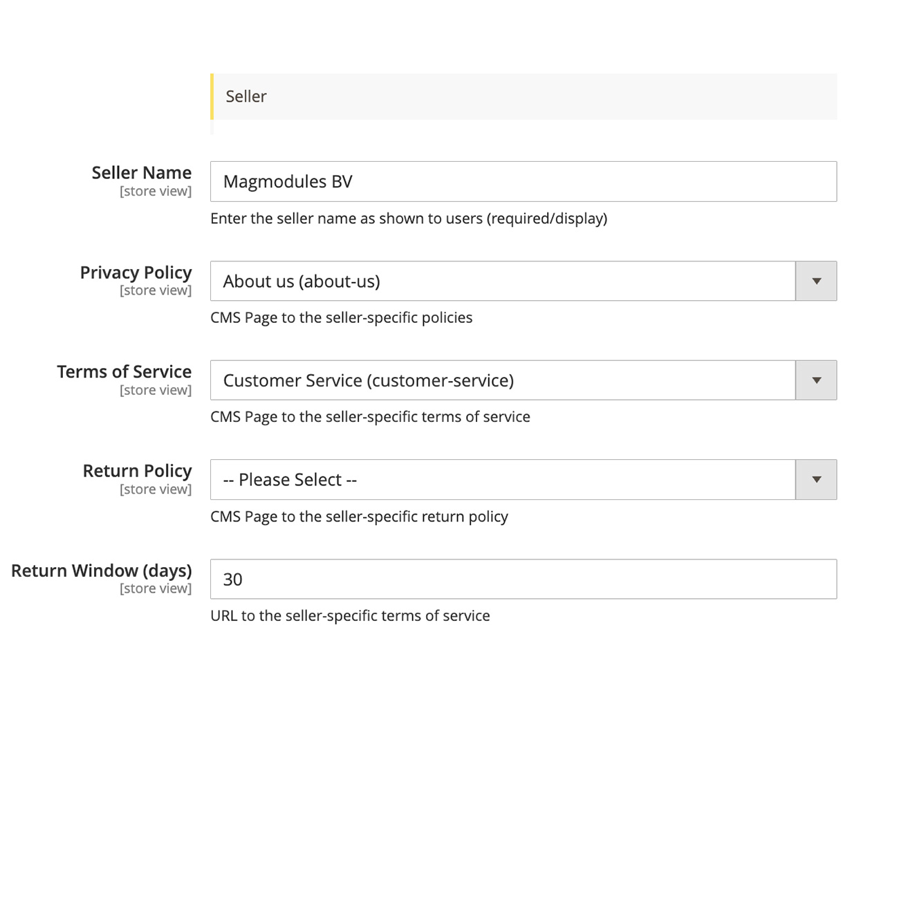 In de sectie Verkoperconfiguratie stel je de basisgegevens van de verkoper in die worden opgenomen in de ChatGPT/OpenAI Commerce Product Feed. Hiermee wordt jouw webshop correct geïdentificeerd en worden belangrijke beleidslinks toegevoegd voor transparantie en naleving.