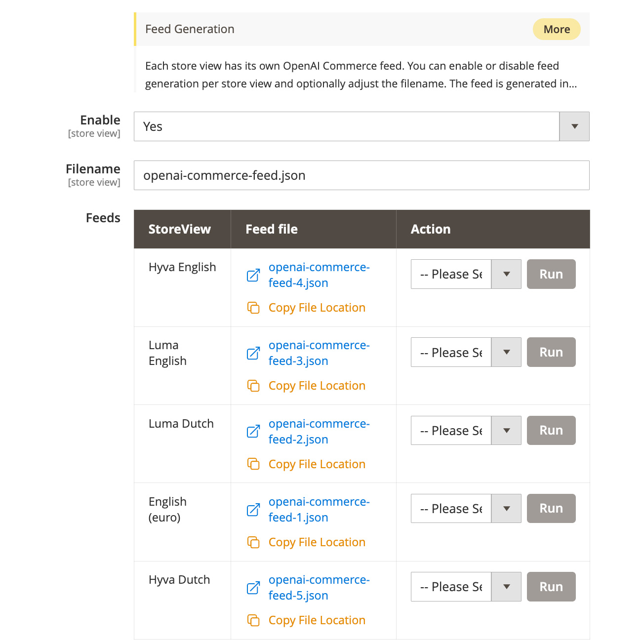 Elke store view heeft zijn eigen OpenAI Commerce-feed. Je kunt de feedgeneratie per store view in- of uitschakelen en optioneel de bestandsnaam aanpassen. De feed wordt gegenereerd in JSON-formaat volgens de OpenAI Commerce-specificatie.