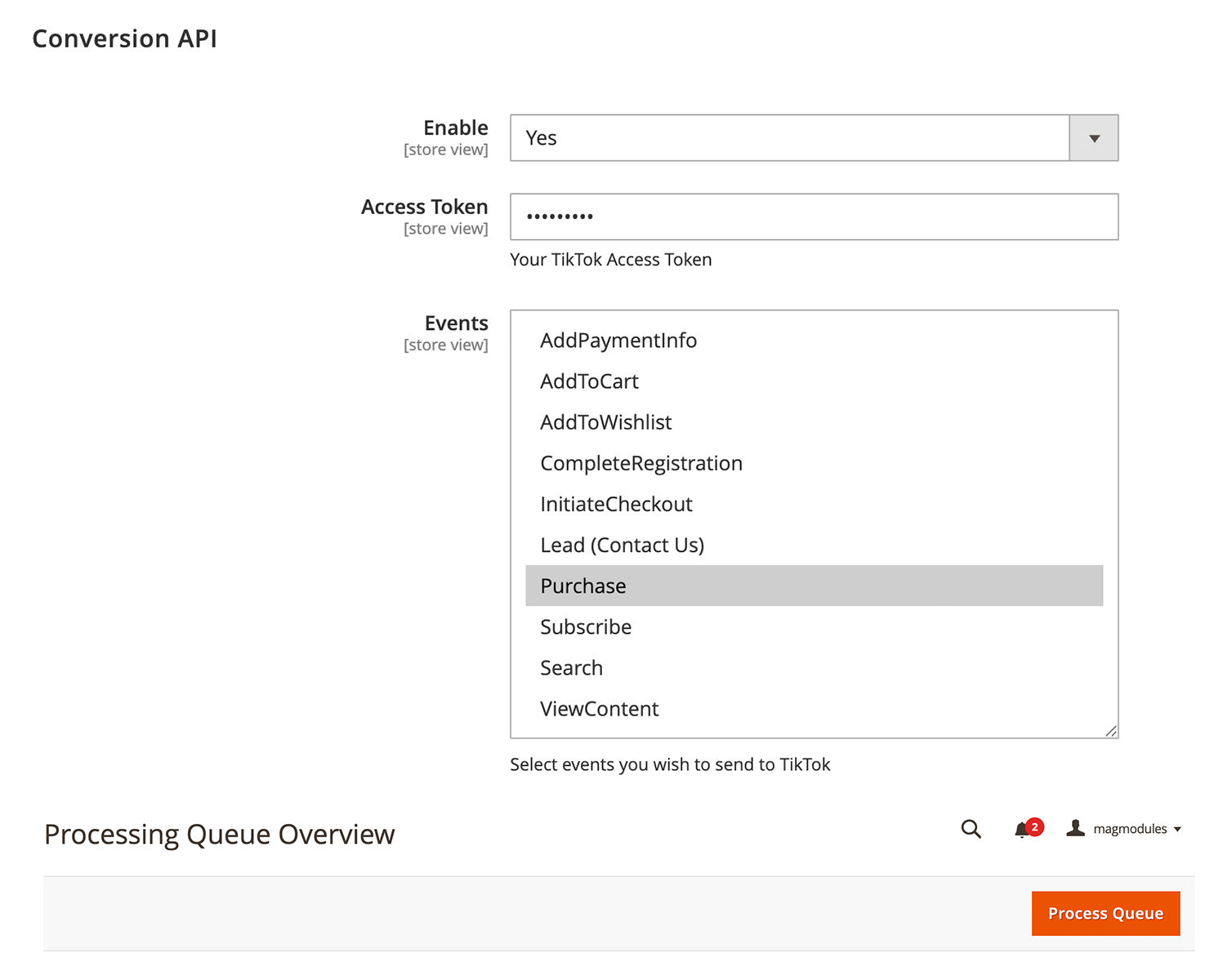 De TikTok Pixel kan direct worden geactiveerd vanuit de Magento-admin. Voer eenvoudig je Pixel ID in en selecteer de belangrijkste events, zoals PageView, AddToCart, InitiateCheckout en Purchase. Er is geen codering vereist — je volgt elke stap in de klantreis met precisie.