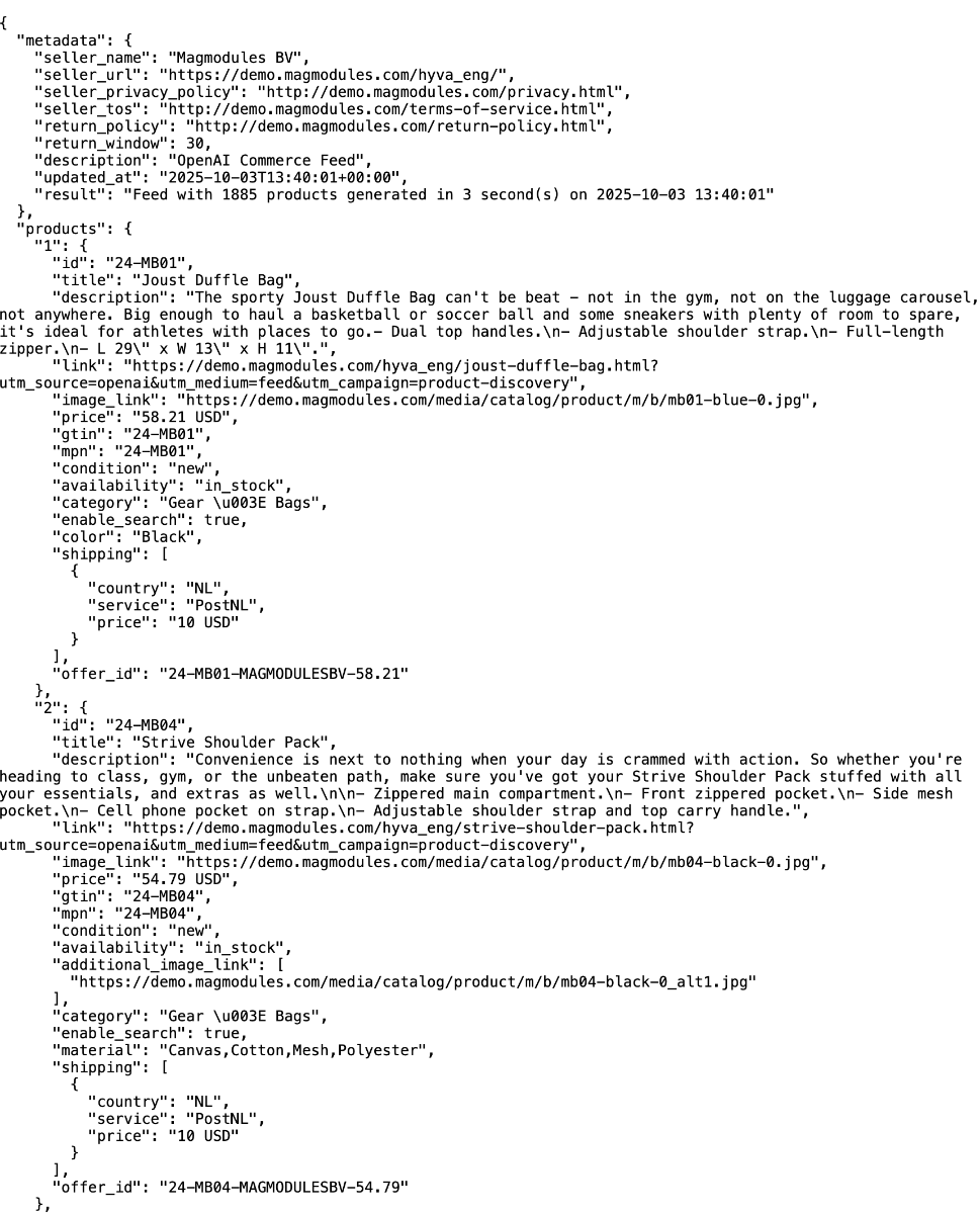De plugin ondersteunt essentiële productkenmerken zoals naam, beschrijving, prijs, beschikbaarheid, afbeeldings-URL's en productlinks met UTM-tracking. Je feed blijft accuraat en up-to-date dankzij de native gegevens uit Magento, wat zorgt voor een soepele integratie met de crawler van OpenAI (OAI-SearchBot).